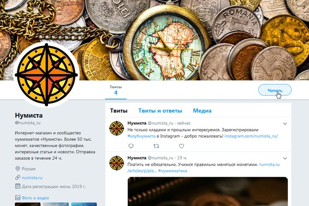- Для тех, кто предпочитает получать новости в ленте Twitter, ссылка на наш твиттер-аккаунт: https://twitter.com/numista_ru